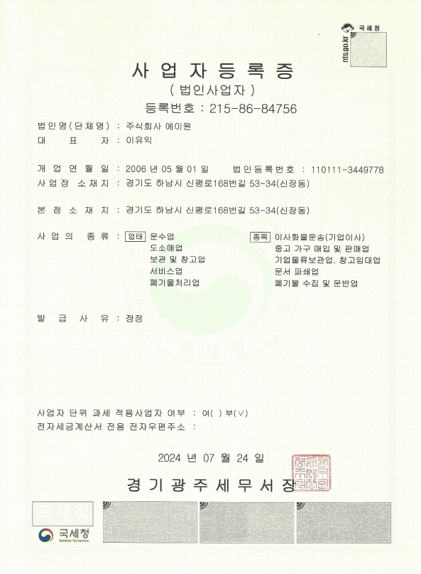 사업자등록증 페이지 정보 작성자 최고관리자 댓글 0건 조회 173회 작성일 23-01-31 17:03 목록 본문 주식회사 에이원 [이 게시물은 최고관리자님에 의해 2025-01-02 13:10:17 인증현황에서 이동 됨] [이 게시물은 최고관리자님에 의해 2025-01-02 13:10:54 인증현황에서 이동 됨] [이 게시물은 최고관리자님에 의해 2025-01-02 13:11:27 인증현황에서 이동 됨] 이전글ISO45001 25.07.08 다음글서비스표등록증 23.01.06